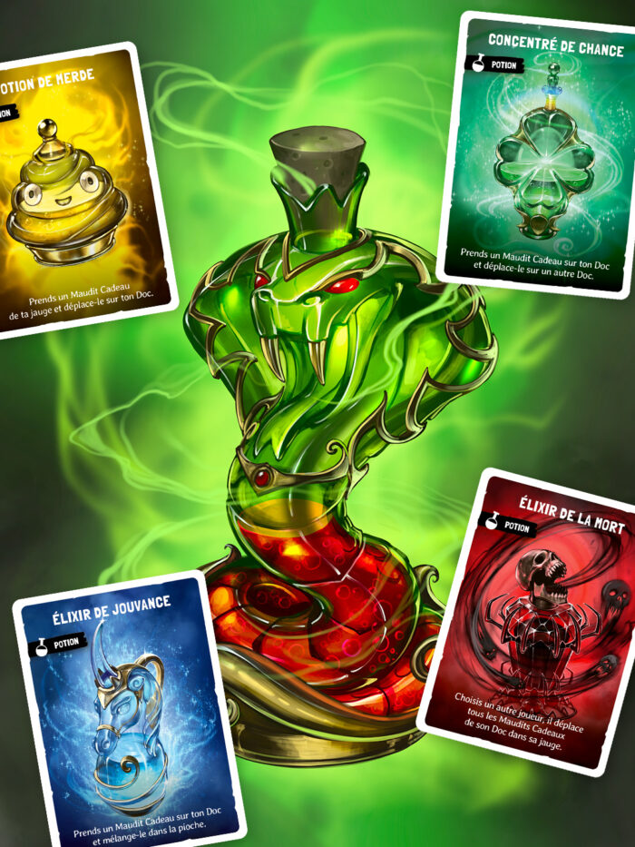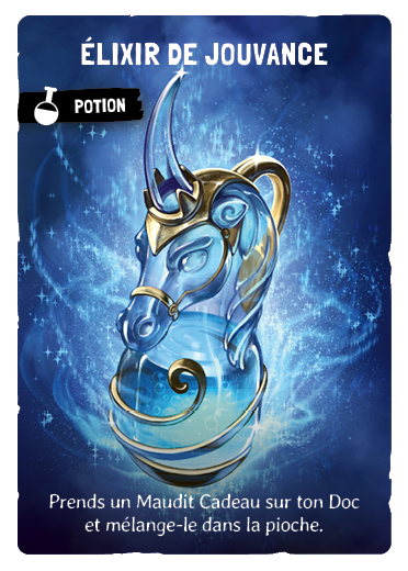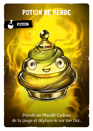 Les potions se jouent exactement comme les Fourberies, c'est à dire pendant ton tour et elles font partie également de la limite des 3 cartes que tu peux jouer. Elles se mélangent dans le deck comme toutes les autres cartes.